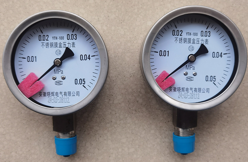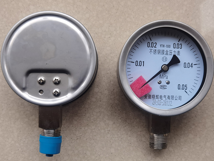 膜盒耐震压力表、膜盒压力表又称为微压表。结构原理是为了增加膜片的位移量,压力表的灵敏度而把两个同心膜片焊接在一起,做成空心膜盒,并用膜盒作为弹性元件用来测量微小压力表叫膜盒压力表。